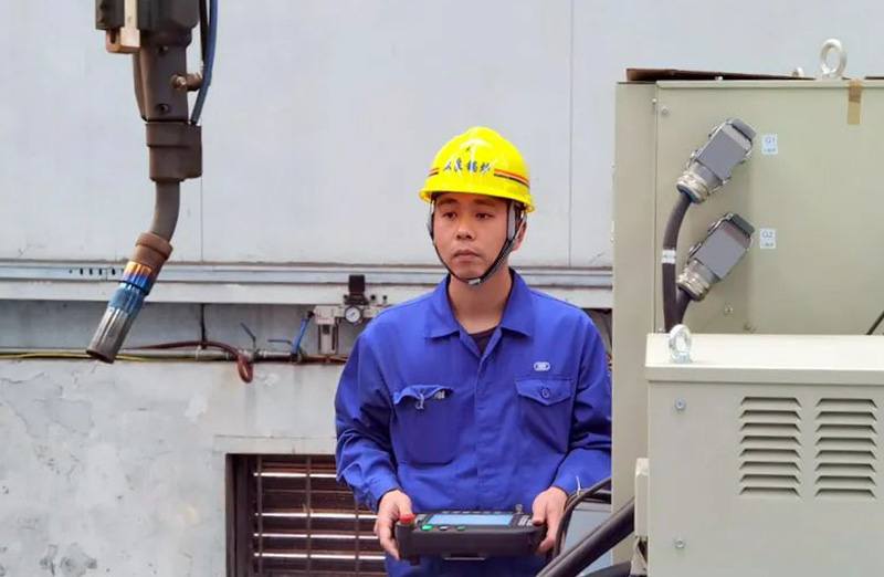 類似設(shè)備技術(shù)改造,吳昊參與完成的項(xiàng)目數(shù)不勝數(shù),比如雙絲埋弧焊焊接電器改造、所有埋弧焊機(jī)無(wú)線遙控改造、組隊(duì)滾輪架拼裝焊接改造、水管鍋筒焊接機(jī)器打磨、模式壁自動(dòng)焊的電焊機(jī)改造等項(xiàng)目。就在剛剛他又和機(jī)修師傅們一起完成一項(xiàng)火管車間管頭打磨機(jī)自動(dòng)化的改造,原來(lái)四五個(gè)人花費(fèi)幾天才能完成的人工打磨,現(xiàn)在只要一人調(diào)運(yùn)上管,按下啟動(dòng)全部自動(dòng)打磨好,省時(shí)省力節(jié)約成本。